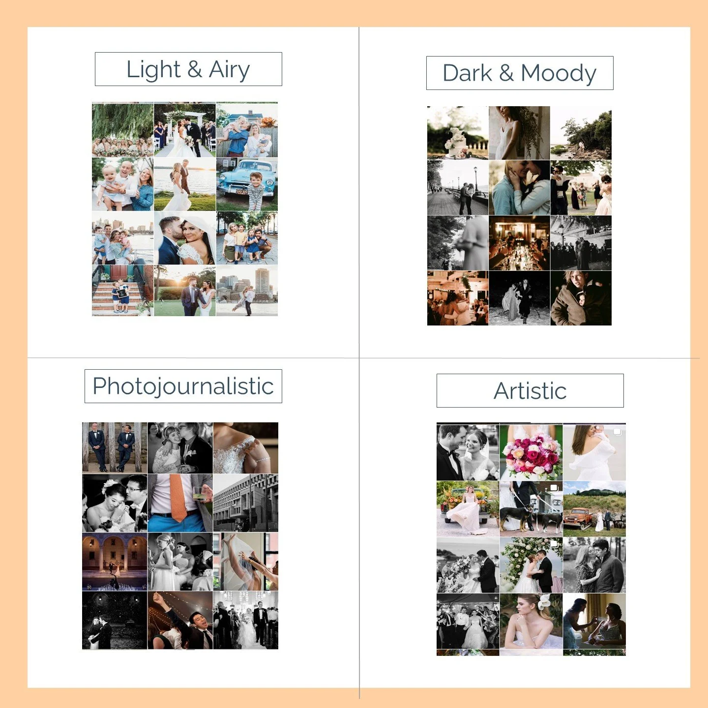 There are various styles of photography, and you should find the one that suits your personality. Look for a photographer who can capture portraits of you as a couple in a way that reflects you both. You might want a romantic tone, a vintage vibe, or a bright stylized look. Do you like light & airy or dark & moody? Fine art photography or documentary style? Whichever you prefer, be sure to find someone who you are confident can deliver that style. You can find more about identifying your perfect style HERE.