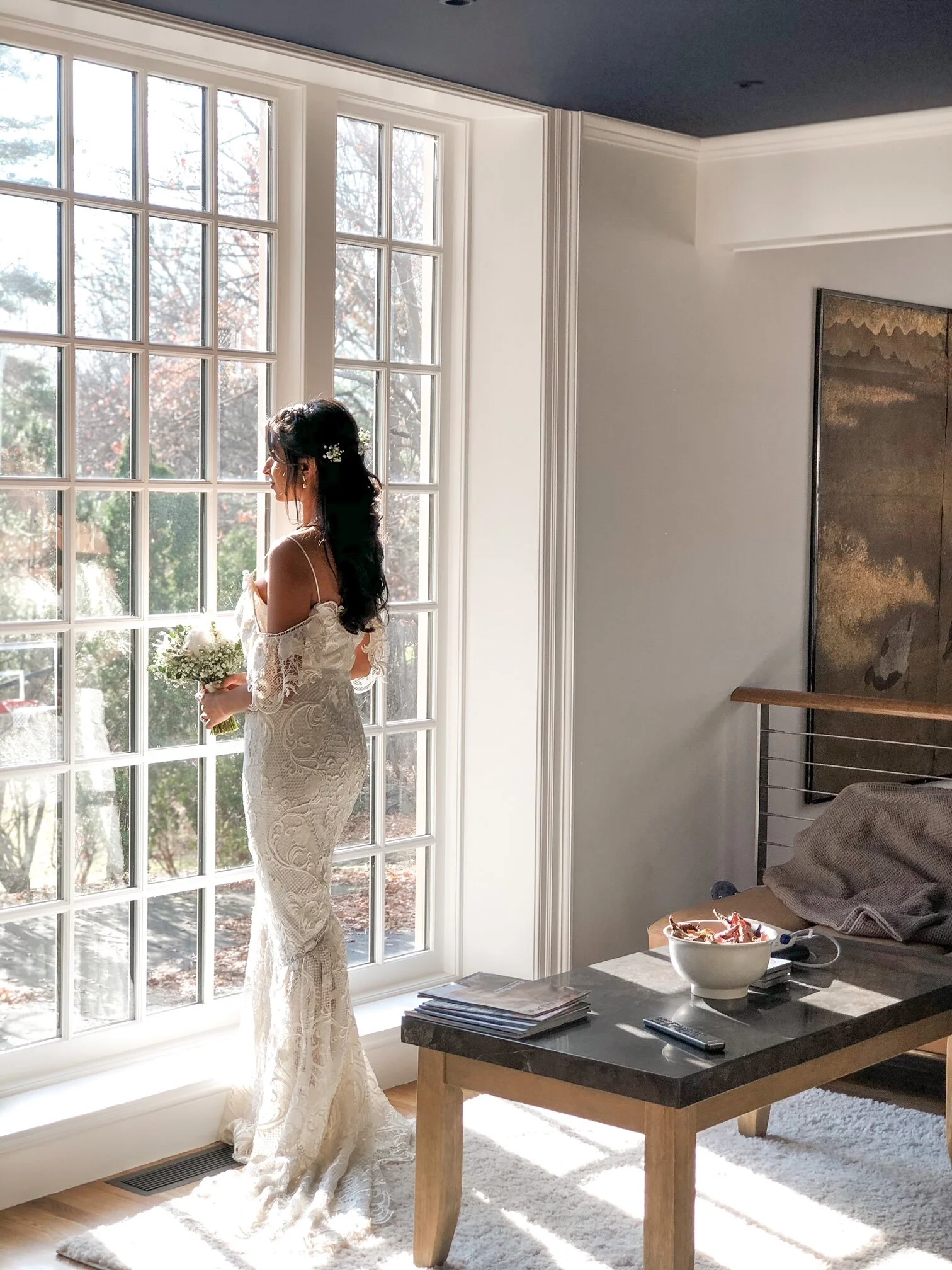 The wedding boom is real! It is the surge that the wedding industry is seeing after a year ++ of downsized events. And honestly, as a wedding planner here in Boston, I’m grateful for it. But maybe (through my rose colored glasses) I’m also feeling proud and nostalgic for the intimate events we pulled off during this last crazy year. Like helping this gorgeous bride create an elopement ceremony in her (stunning) dining room in her Chestnut Hill home with only her now husband and their officiant present. Because her family couldn’t travel to be at the wedding from overseas she said to me, “If my mum can’t be beside me on my wedding day, then I don’t think that anyone else should be either.” For the record, I’m not encouraging an elopement….I want everyone who wants to party to go out there and throw the biggest shindig that they can dream up (ahem….I can help!)…but for some, an in-home or backyard wedding fits the bill. Just like it did for T&D’s wedding. And I’m here for that too. To create the design we cleared out the dining room and then brought in large mirrors, throw blankets, and tons of lanterns and candles. I decorated the hoop with vines from their garden, dried pampas grass and some hydrangea. Sharing some of my favorite shots from the room….all taken with my iPhone!